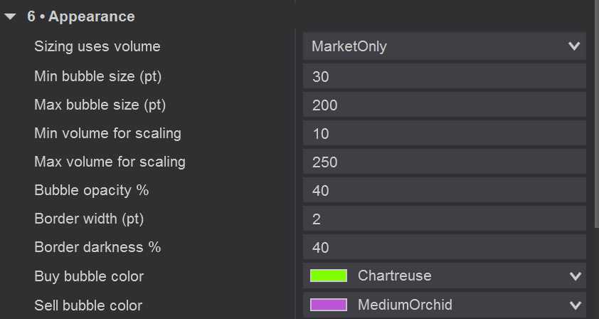 This setting tells the indicator: “If aggressive trades happen within this many milliseconds, treat them as one sweep.” A larger window = more grouping, a smaller window = more precision.