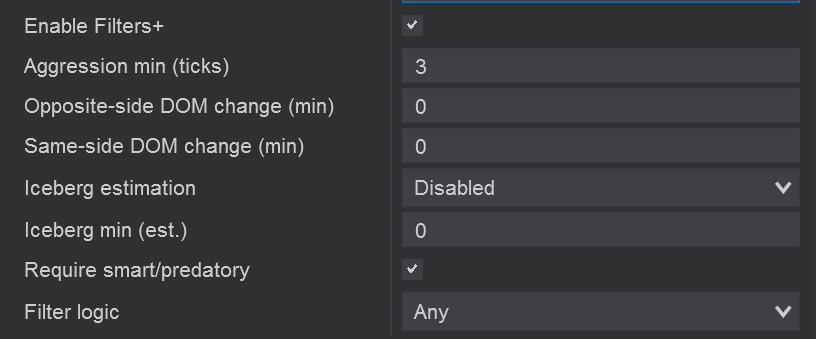 This section contains all the settings that control how Sweep Mode detects fast, aggressive sequences of trades – including timing, price-range sensitivity, DOM behavior, and advanced filters that help you isolate only the strongest sweep events. ❗It is working only when the sweep mode is selected.