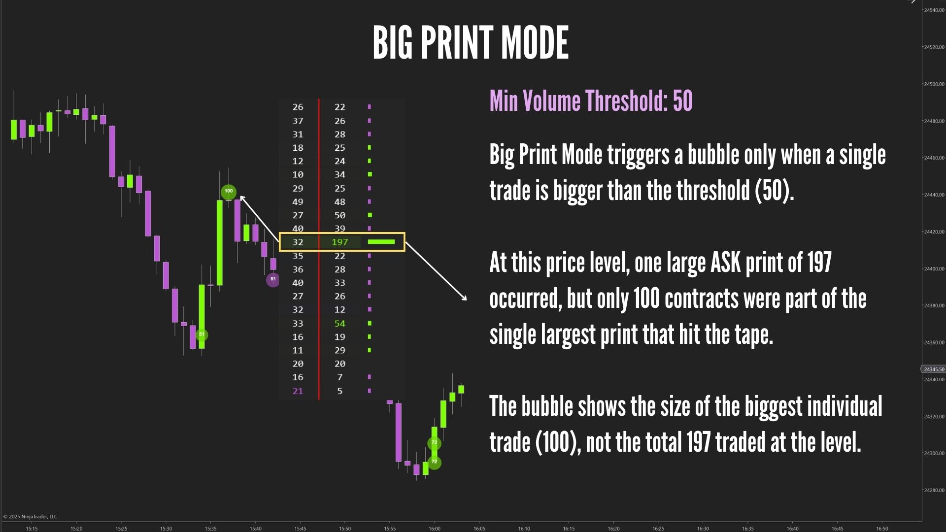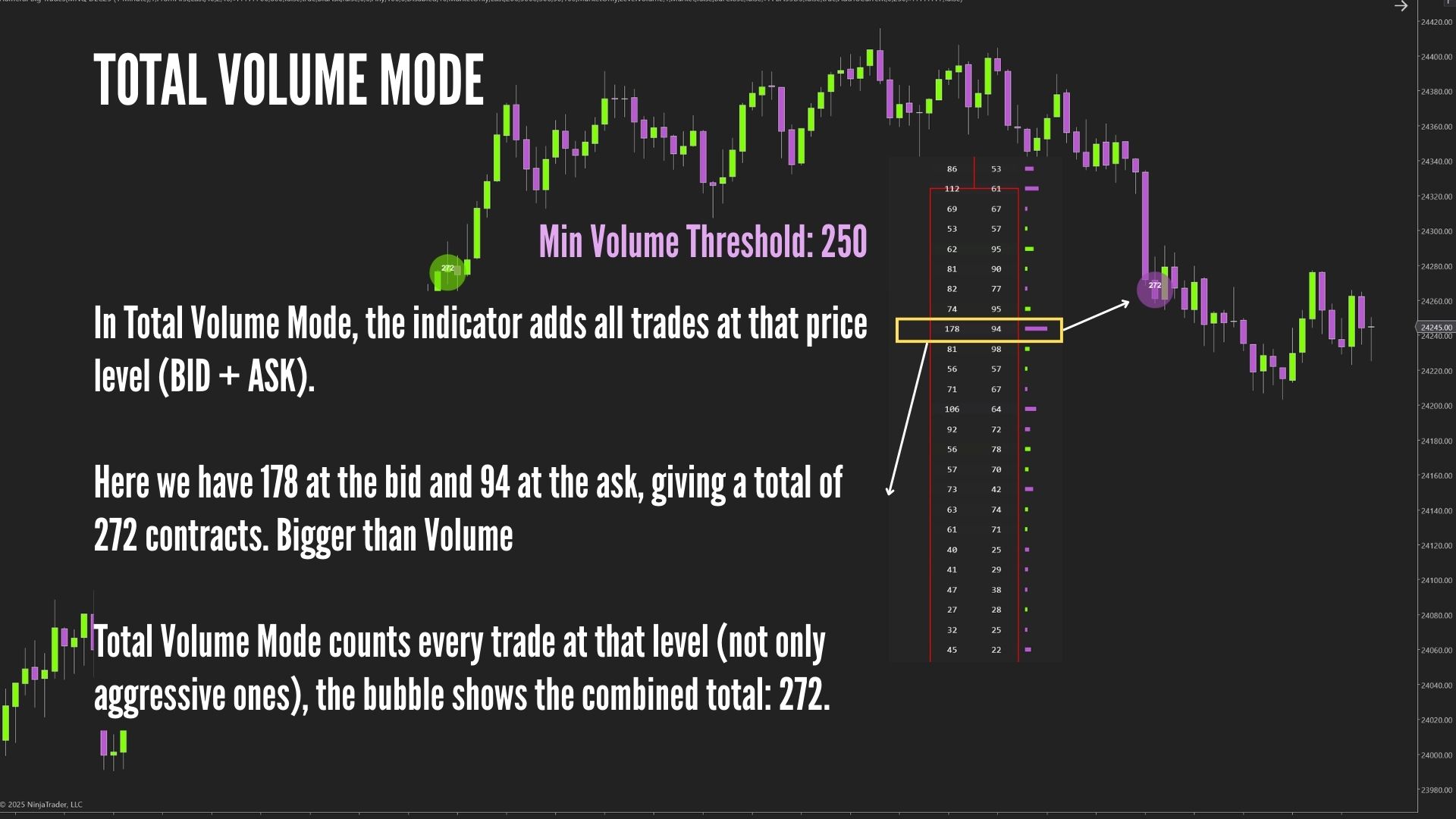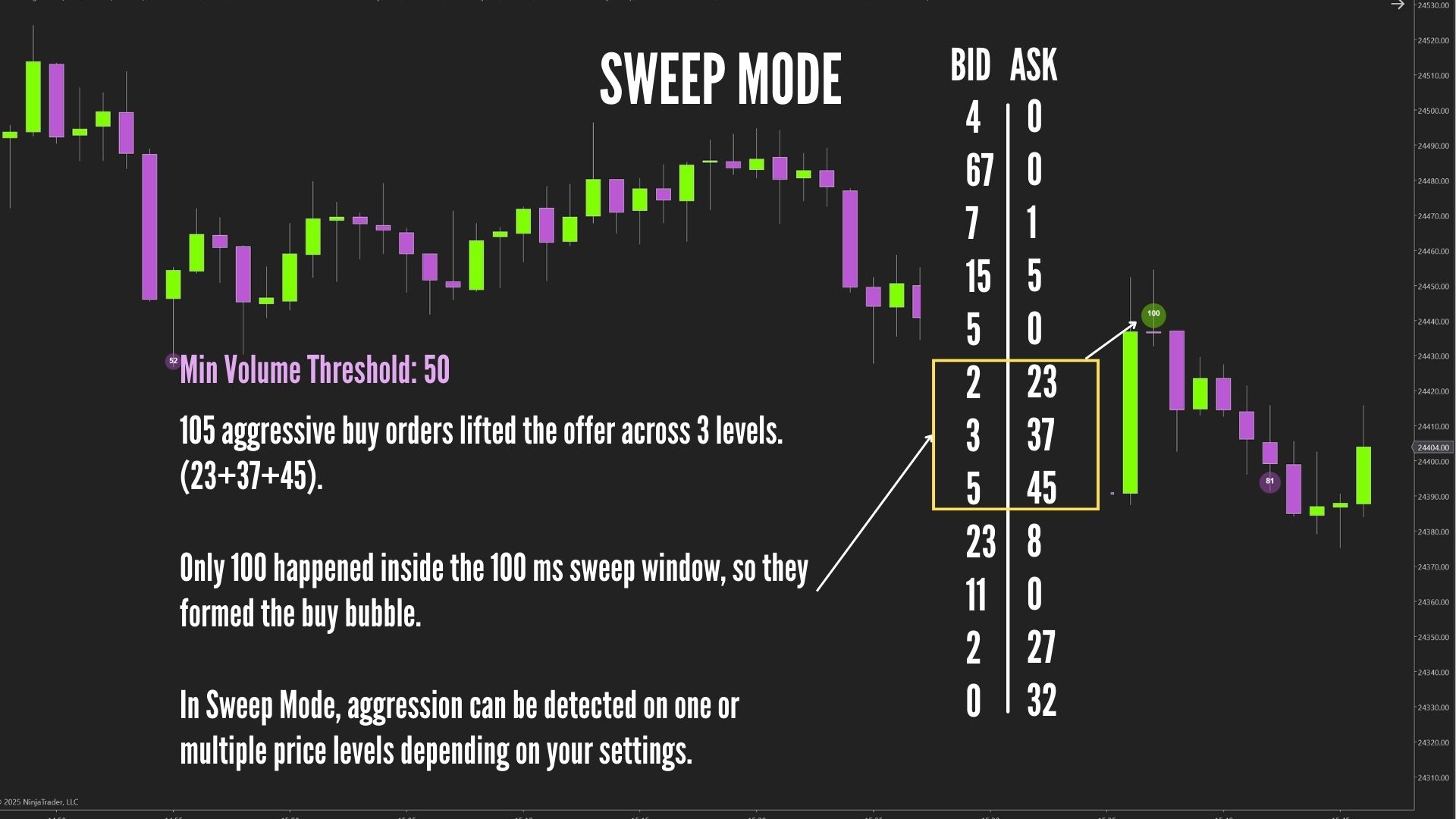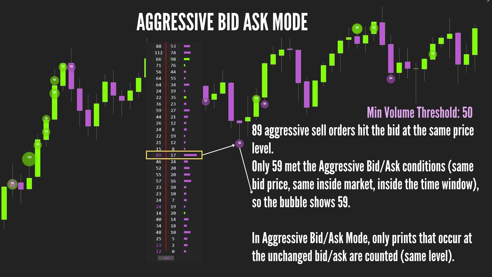 Groups trades that hit the bid or ask and shows a bubble only when the bid or ask volume is bigger than your Min Volume Threshold, while the inside price (best bid/ask) stays the same.
