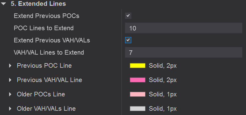 • Extend previous POC, VAH, VAL levels to visualize important historical price zones.