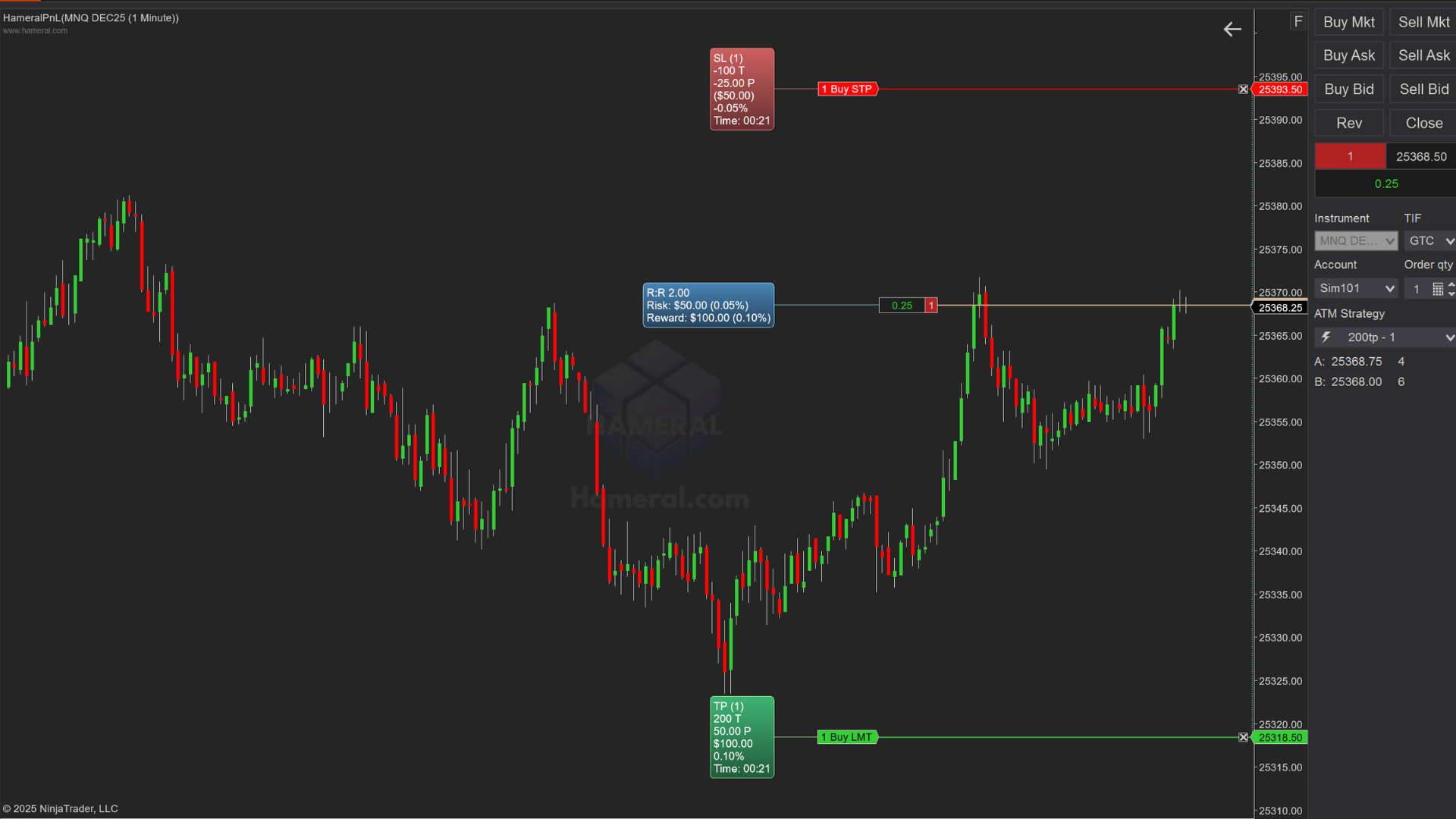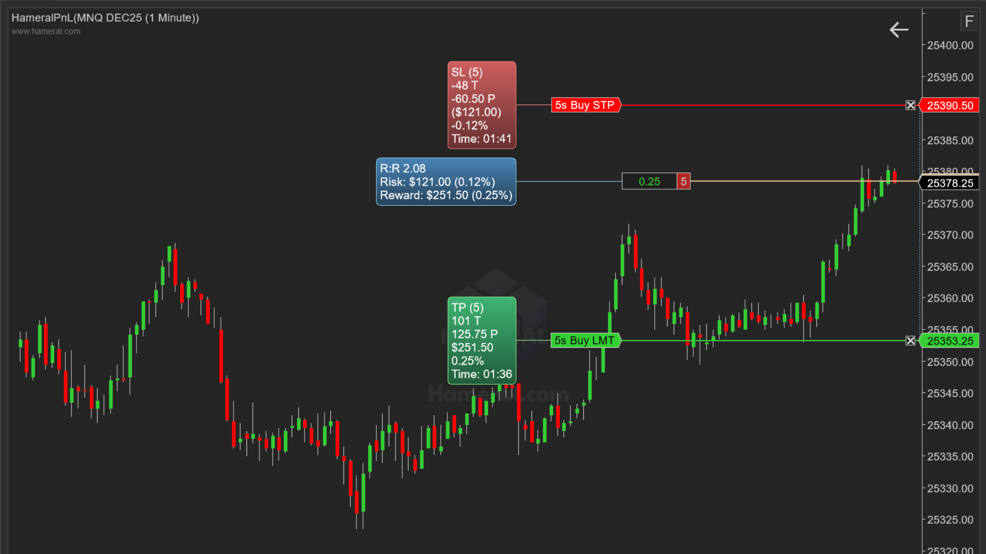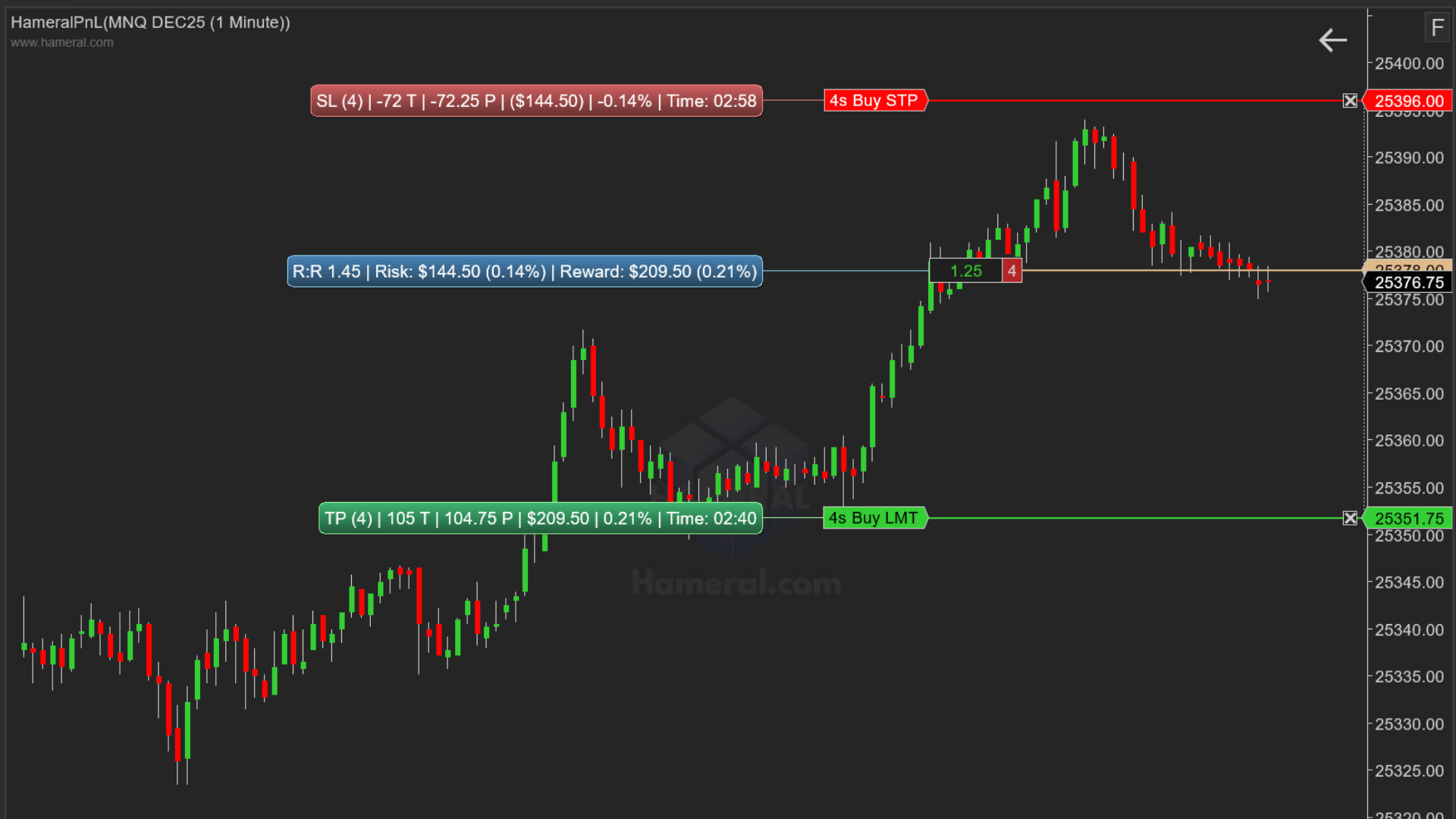 For risk management, Hameral PnL can display a dedicated entry readout showing Risk:Reward, total risk, total reward, and optional % risk / % reward — so you know exactly what you’re trading before you click anything.