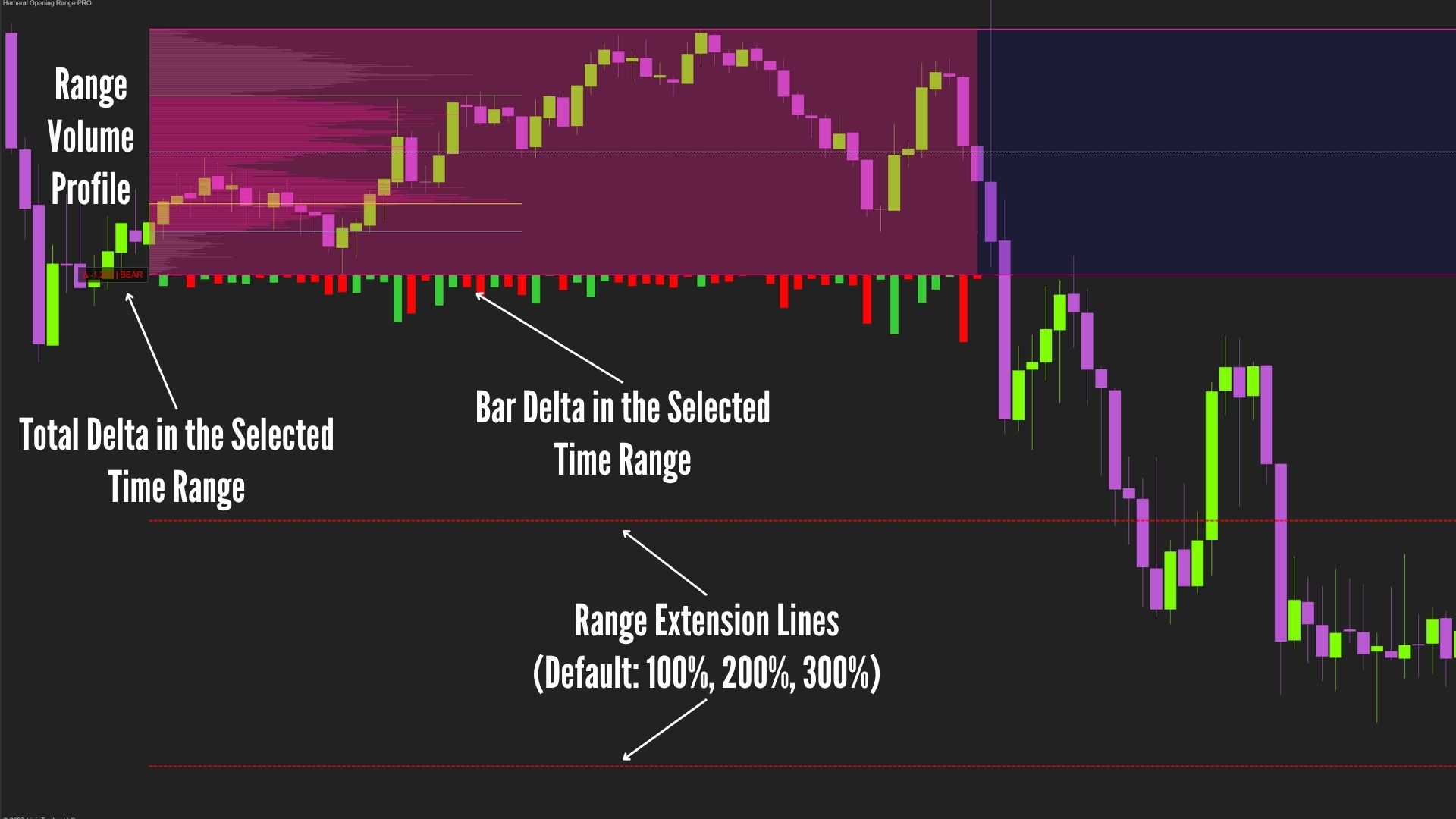 Example: strong negative cumulative delta combined with a downside break and aggressive candles may indicate bearish intent. - Range extension lines for target projection, with default levels at 100%, 200%, and 300% of the range